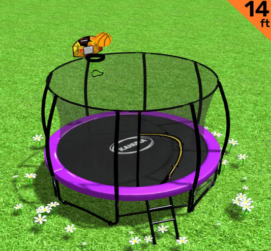 Kahuna 14ft Outdoor Trampoline Kids Children With Safety Enclosure Pad Mat Ladder Basketball Hoop Set - Purple