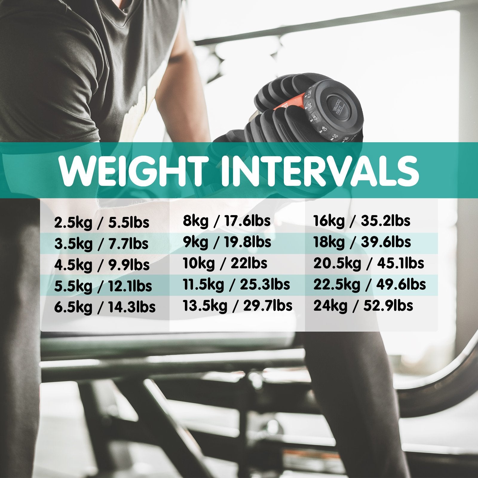 - Weight range: 5-52.5lb (2.3-24kg) each