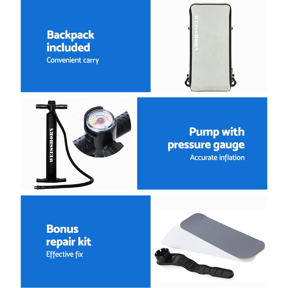 Our Weisshorn Stand-up Paddle Board is designed to suit the beginner paddler as well as a seasoned and easily fits both paddler and passenger for hours of maximum enjoyment. Better still, it is made from durable drop-stitch core material and easy to inflate and deflate, with similar build qualities that you will find with its pricier fibreglass counterparts. It maintains rigidity and toughness with a thickness of 15cm and has a weight capacity of up to 185kg. The supplied 1.7m adjustable aluminium paddle is highly versatile in both paddling and steering while the three fins underneath the board ensure steady gliding, easy maneuverability and smooth turning. In fact, one of the fins is removable to give better directional stability. Getting your aquatic escapades started with the paddle board is a simple task of inflating it with the included pump and you are good to row. And because it can be packed away into its handy travel bag, you can take the paddle board just about anywhere you want to go for your water adventures. Also included is a repair kit and a quality adjustable kayak seat that can turn your paddle board into a kayak to enhance your comfort. The kayak seat also comes with a storage pocket where you can conveniently place your personal belongings.
